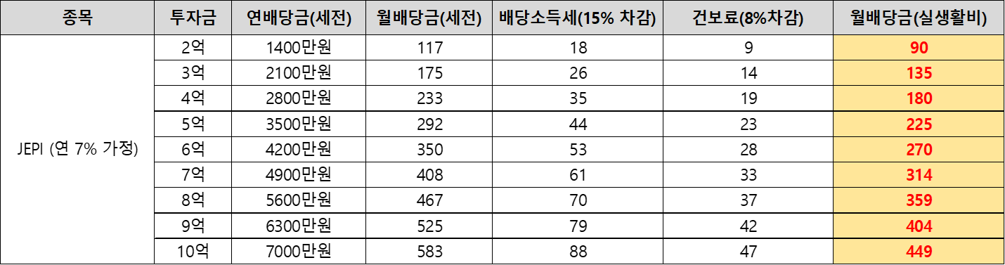 파이어족이 되어 주식으로 월배당을 받으면 실제 얼마를 받을 수 있을까?지금부터 알아보자. 세금 폭탄이 2가지가 있다.1. 금융소득종합과세 (이자소득, 배당소득)2. 건강보험료 - 종합소득과세자는 연 2000만원 이하 15.4% 분리과세하고 연 2000만원 초과하는 경우 소득별로 세율을 적용한다.- 배당금만 받을경우(미국주식해당) 연 7800만원까지 추가 세금이 없다.- 근로소득 + 배당금을 받는 경우 근로소득 1억, 배당금 4000만원이라면 2000만원 15.4% 분리과세하고 2000만원 초과금액 38.4% 세금이 부과되니 이점 유의해야한다. (!! 맞벌이 부부인경우 각자 명의 활용하여 배당금 2000만원 이하로 셋팅하면 세금 절세가 가능하다) 파이어족은 직장이 아니므로 지역가입자 기준으로 월배당금 실생..