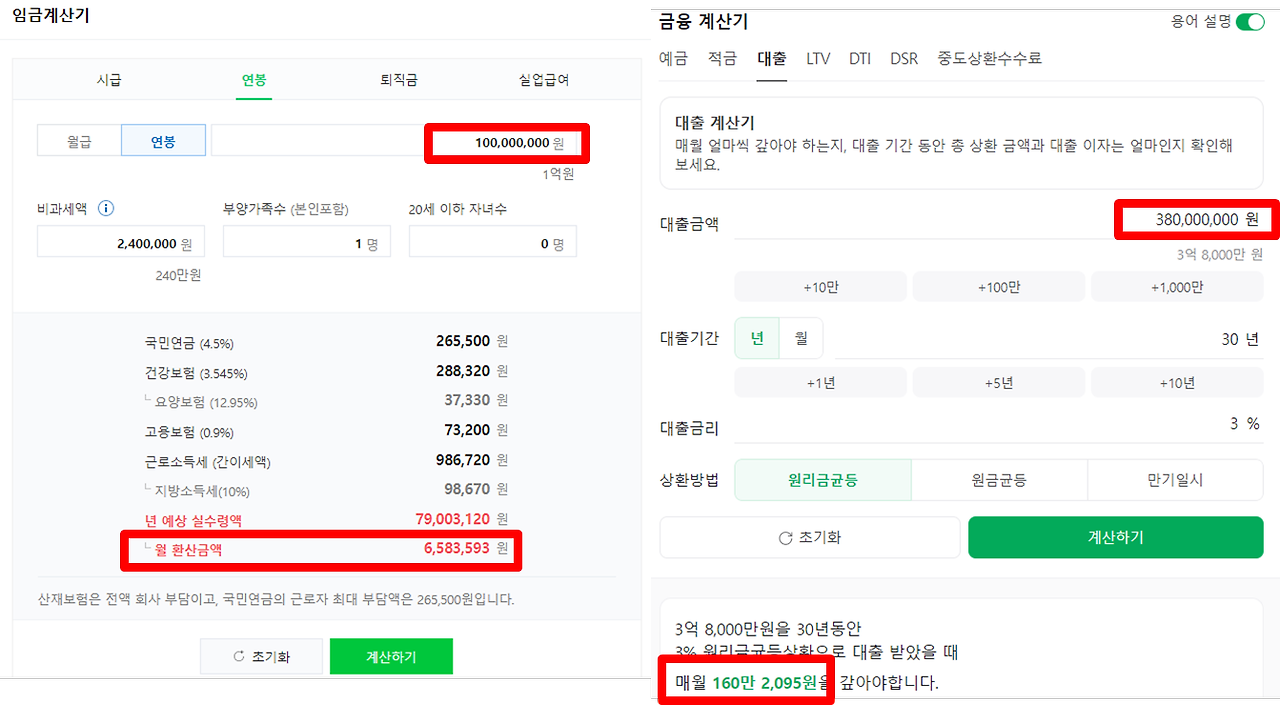 연봉이 1억 원(월환산 658만 원)이라면,대출 3.8억(30년, 3%, 원리금균등 매월 160만 원 상환)이 적당하다.